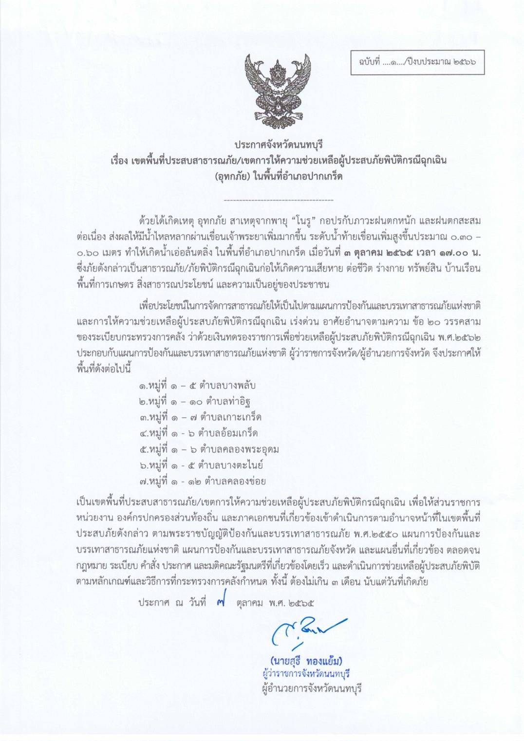 จากกรณีวันนี้ (7 ต.ค.65) นายสุธี ทองแย้ม ผู้ว่าราชการจ.นนทบุรี ได้มีประกาศจังหวัดนนทบุรี ฉบับที่ 1 / ปีงบประมาณ 2566 เรื่อง เขตพื้นที่ประสบสาธารณภัย/เขตการให้ความช่วยเหลือผู้ประสบภัยพิบัติกรณีฉุกเฉิน(อุทกภัย) ในพื้นที่อำเภอปากเกร็ด ด้วยได้เกิดเหตุอุทกภัย สาเหตุจากพายุ "โนรู" กอปรกับภาวะฝนตกหนัก และฝนตกสะสมต่อเนื่อง ส่งผลให้มีน้ำไหลหลากผ่านเขื่อนเจ้าพระยาเพิ่มมากขึ้น ระดับน้ำท้ายเขื่อนเพิ่มสูงขึ้นประมาณ 0.30 - 0.60 เมตร ทำให้เกิดน้ำเอ่อล้นตลิ่ง ในพื้นที่อำเภอปากเกร็ด เมื่อวันที่ 3 ตุลาคม 2565 เวลา 17.00 น. ซึ่งภัยดังกล่าวเป็นสาธารณภัย/ภัยพิบัติกรณีฉุกเฉินก่อให้เกิดความเสียหาย ต่อชีวิต ร่างกาย ทรัพย์สิน บ้านเรือนพื้นที่การเกษตร สิ่งสาธารณประโยชน์ และความเป็นอยู่ของประชาชน เพื่อประโยชน์ในการจัดการสาธารณภัยให้เป็นไปตามแผนการป้องกันและบรรเทาสาธารณภัยแห่งชาติและการให้ความช่วยเหลือผู้ประสบภัยพิบัติกรณีฉุกเฉิน เร่งด่วน อาศัยอำนาจตามความ ข้อ 20 วรรคสามของระเบียบกระทรวงการคลัง ว่าด้วยเงินทดรองราชการเพื่อช่วยเหลือผู้ประสบภัยพิบัติกรณีฉุกเฉิน พ.ศ.2562 ประกอบกับแผนการป้องกันและบรรเทาสาธรณภัยแห่งชาติ ผู้ว่าราชการจังหวัด/ผู้อำนวยการจังหวัด จึงประกาศให้พื้นที่ดังต่อไปนี้