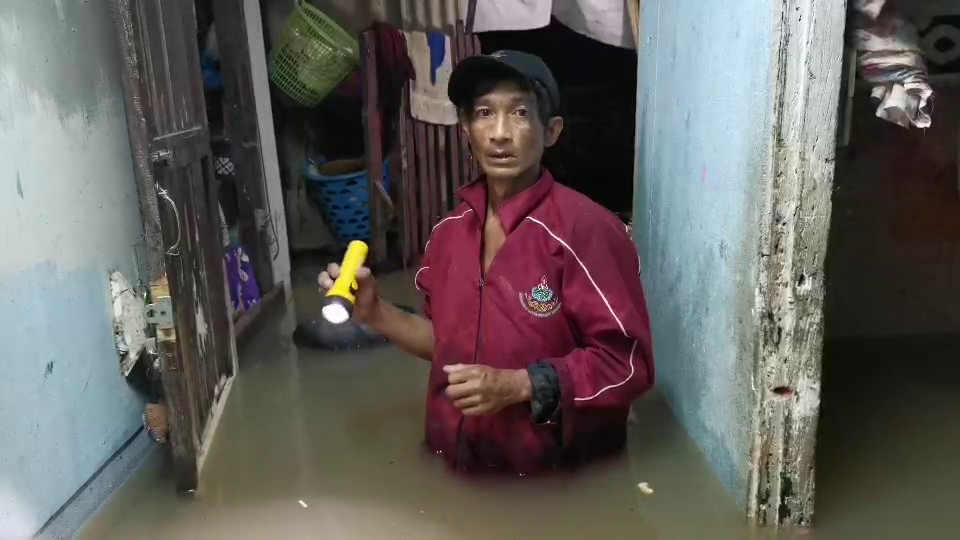 นายสัมพันธ์ อนุรักษ์สกุล อายุ 35 ปี (เสื้อสีน้ำตาล) เจ้าของร้านขายของชำกล่าวว่า ถ้าน้ำขึ้นมาอีก ตนคงลำบากเนื่องจากตู้ แช่น้ำอัดลมมีหลายตู้ มีน้ำหนักเยอะ ยกไม่ไหวคงต้องปล่อยจมน้ำปีนี้น้ำมากกว่าปีที่แล้ว