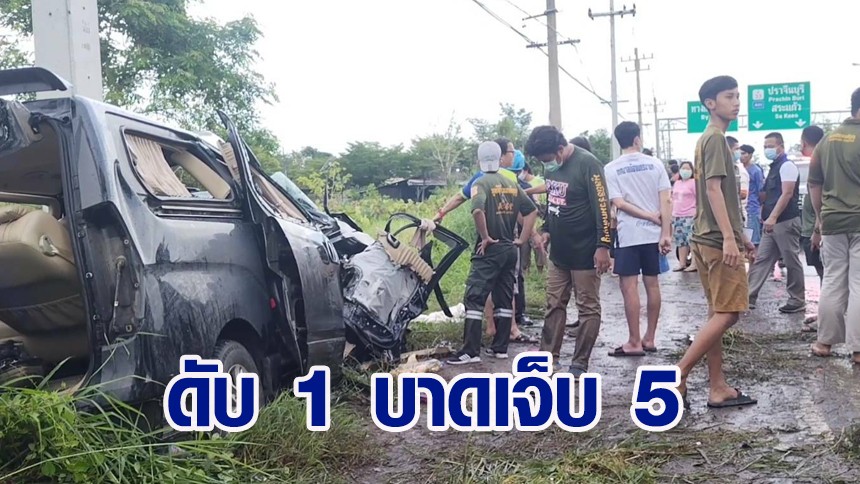 สลด! ฝนตกถนนลื่นรถตู้เสียหลักชนเสาไฟ ผู้โดยสารกระเด็นตกน้ำดับ 1 บาดเจ็บ 5