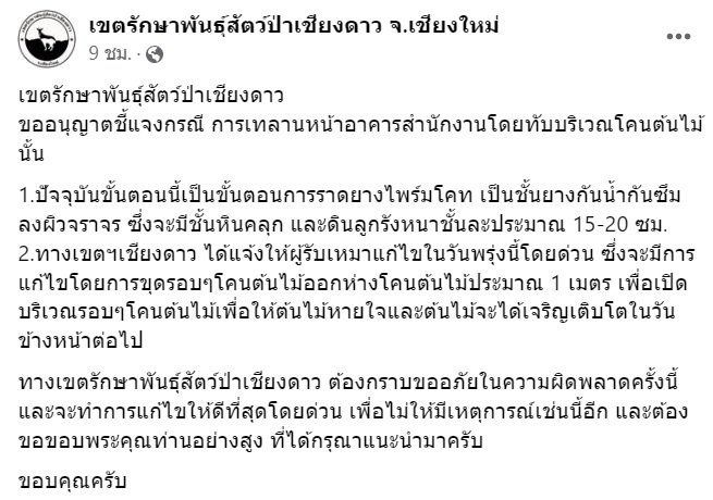 วิจารณ์สนั่น! ราดยางมะตอยกลางป่าเชียงดาว จ.เชียงใหม่ เตรียมทำเป็นที่จอดรถ แต่ต้นไม้เสี่ยงยืนต้นตาย โซเชียลตั้งคำถาม เจ้าหน้าที่คิดอะไรอยู่?? ล่าสุด เขตรักษาพันธุ์สัตว์ป่าเชียงดาว โพสต์ขอโทษ เตรียมเร่งแก้ไข