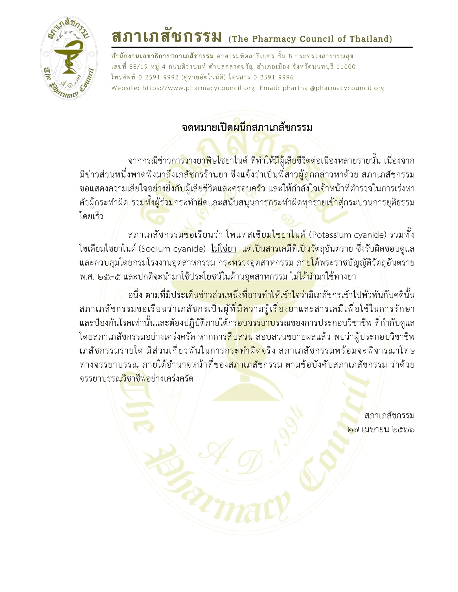 สภาเภสัชกรรมขอเรียนว่า ‘โพแทสเซียมไซยาไนด์’ รวมทั้ง ‘โซเดียมไซยาไนด์’ ไม่ใช่ยา แต่เป็นสารเคมีที่เป็นวัตถุอันตราย ซึ่งรับผิดชอบดูแล และควบคุมโดยกรมโรงงานอุตสาหกรรม กระทรวงอุตสาหกรรม ภายใต้ พระราชบัญญัติวัตถุอันตราย พ.ศ.2535 และปกติจะนำมาใช้ประโยชน์ในด้านอุตสาหกรรม ไม่ได้นำมาใช้ทางยา