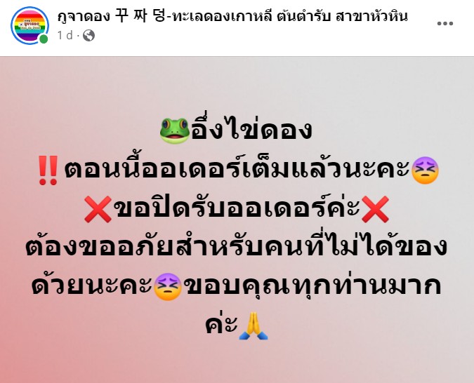 ล่าสุด ร้านกูจาดองได้ปิดรับออเดอร์แล้ว พร้อมบอกลูกค้าว่าเจออึ่งไข่ดองได้ใหม่ปีหน้า เพราะอึ่งไข่ 1 ปีมีครั้งเดียวเท่านั้น