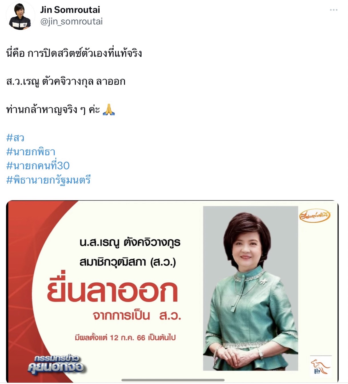 เพียง 1 วันก่อนการโหวตเสนอนายกรัฐมนตรี คนที่ 30 จะเริ่มขึ้น น.ส.เรณู ตังคจิวางกูร สมาชิกวุฒิสภา (ส.ว.) หนึ่งในวุฒิสภา 250 เสียง ที่จะมีผลต่อการแต่งตั้งนายกรัฐมนตรี ได้ยื่นหนังสือแสดงความประสงค์ขอลาออกจากการเป็นสมาชิก เมื่อวันที่ 11 กรกฎาคม 2566 เป็นผลให้นับตั้งแต่ วันที่ 12 กรกฎาคม 2566 เรณู ได้ถือว่าลาออกจากการเป็นสมาชิก ส.ว. เป็นที่เรียบร้อย