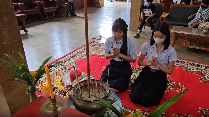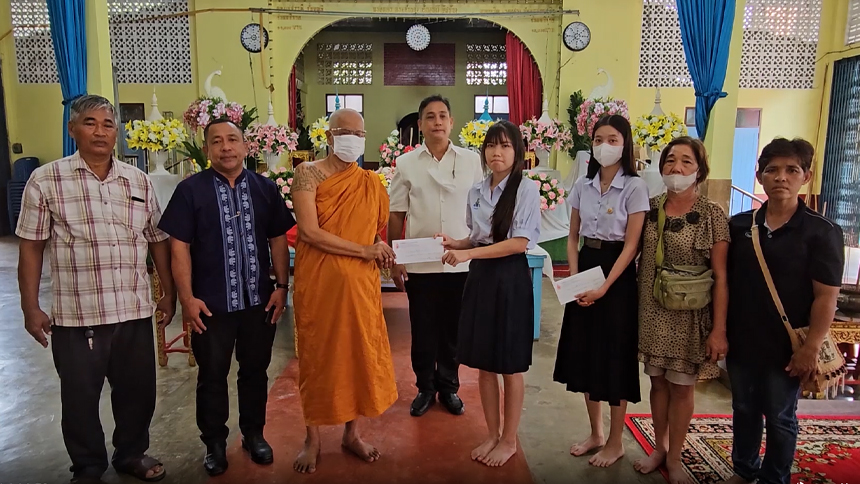 ต่อมาเวลา 11.00 น. พระเมธีวัชรประชาทร เจ้าอาวาสวัดอินทาราม ได้เดินทางมามอบทุนการศึกษาให้กับ บุตรสาวผู้เสียชีวิตทั้งสองรายรายละ 5,000 บาทรวม 10,000 บาท และรับเป็นเจ้าภาพสวดพระอภิธรรมศพคืนแรก