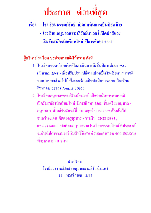 โรงเรียนธรรมภิรักษ์ ทำหนังสือด่วนที่สุด ประกาศปิดตัว โดยจะเปิดเรียนเป็นปีสุดท้าย หลังจากนี้จะเปลี่ยนเป็นโรงเรียนนานาชาติ จากสิงคโปร์ เปิดสอน ส.ค.69