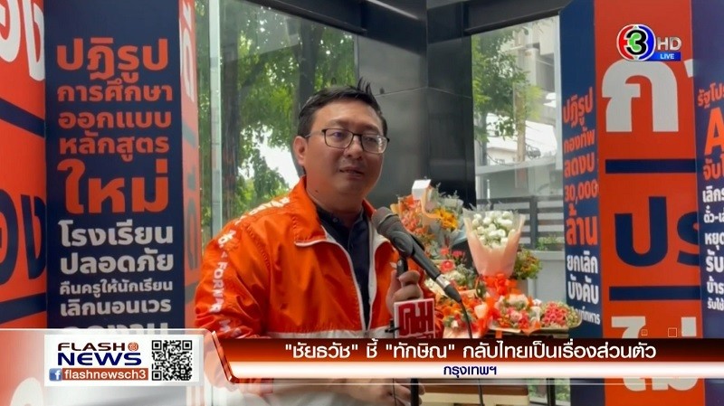 นายชัยธวัช ตุลาธน เลขาธิการพรรคก้าวไกล เผยกรณีนายทักษิณ ชินวัตร เตรียมกลับไทยวันที่ 10 สิงหาคม เป็นเรื่องส่วนตัว เชื่อไม่กระทบจัดตั้งรัฐบาล ส่วนข่าวแกนนำคนสำคัญของพรรคก้าวไกลไปพบนายทักษิณที่ฮ่องกงนั้น นายชัยธวัช ยืนยันไม่น่าจะมีการพูดคุยกันอย่างที่เป็นข่าว