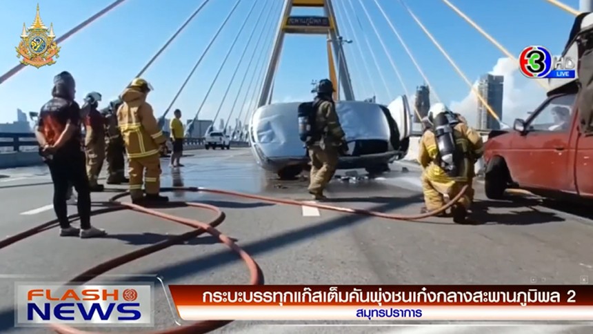- ระทึก! กระบะบรรทุกแก๊สเต็มคันพุ่งชนเก๋งกลางสะพานภูมิพล 2
