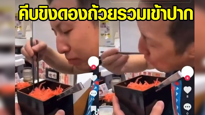 ในคลิปจะเห็นผู้ชายคนนี้ ใช้ตะเกียบคีบขิงดองจากกะปุกส่วนรวม สำหรับใช้โรยหน้าบนข้าวหน้าเนื้อ จากถ้วยภาชนะสีดำ ซึ่งเป็นของส่วนกลาง แล้วนำเข้าปากตัวเองโดยตรง แทนที่จะใช้ที่คีบอาหาร ก่อนจะคีบกินซ้ำๆ