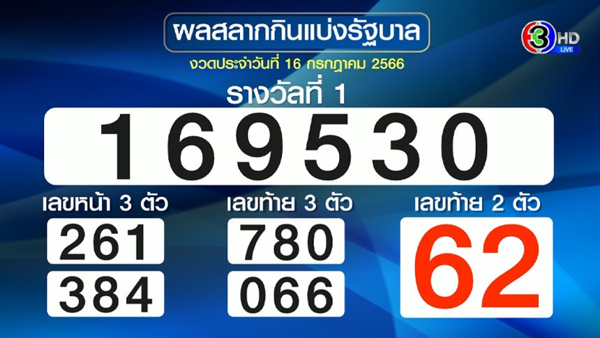 ผลรางวัลสลากกินแบ่งรัฐบาล ประจำงวดวันที่ 16 กรกฎาคม 2566