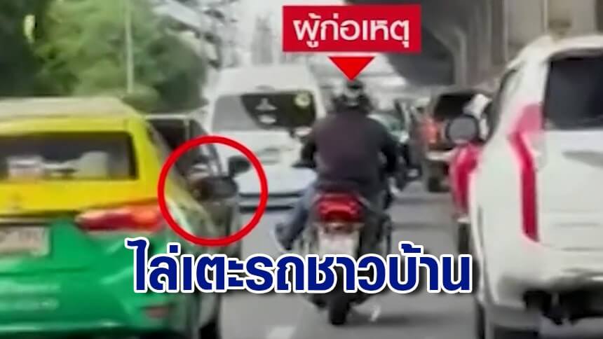 พี่ทำเพื่อ? ชายขี่จยย.ไปไล่เตะรถคันอื่นไป ตร.เผยรู้ตัวแล้ว จ่อแจ้ง 4 ข้อหา