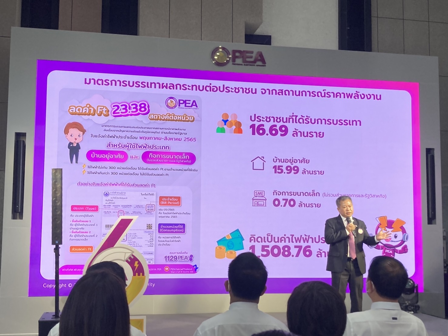 - มาตรการบรรเทาผลกระทบต่อประชาชนจากสถานการณ์ราคาพลังงาน สำหรับผู้ใช้ไฟฟ้าประเภท บ้านอยู่อาศัยได้รับการช่วยเหลือประมาณ 15.99 ล้านราย ผู้ใช้ไฟฟ้าประเภทกิจการขนาดเล็ก (ไม่รวมส่วนราชการและรัฐวิสาหกิจ) ได้รับการช่วยเหลือประมาณ 7 แสนราย รวม 16.69 ล้านราย คิดเป็นเงินประมาณ 1,508.76 ล้านบาท