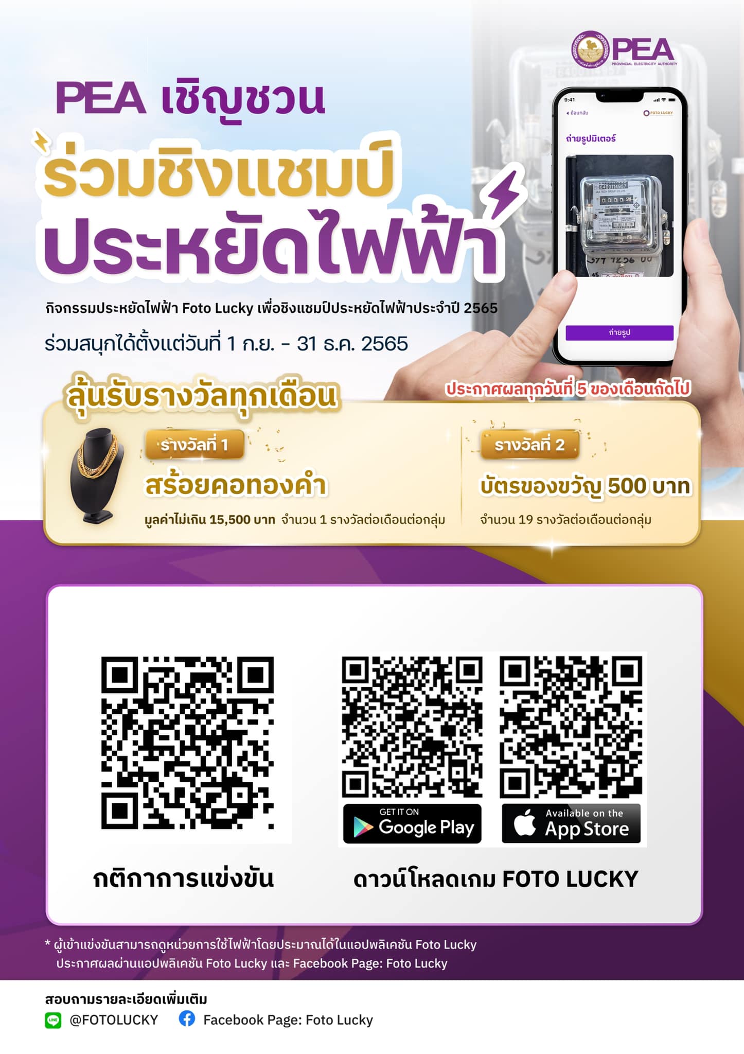 อีกทั้ง PEA ยังเชิญชวนร่วมชิงแชมป์ประหยัดไฟฟ้า ประจำปี 2565 กิจกรรมประหยัดไฟฟ้า (Foto Lucky) เพื่อชิงรางวัลสร้อยคอทองคำและบัตรของขวัญทุกเดือน ร่วมสนุกได้ตั้งแต่วันที่ 1 กันยายน - 31 ธันวาคม 2565
