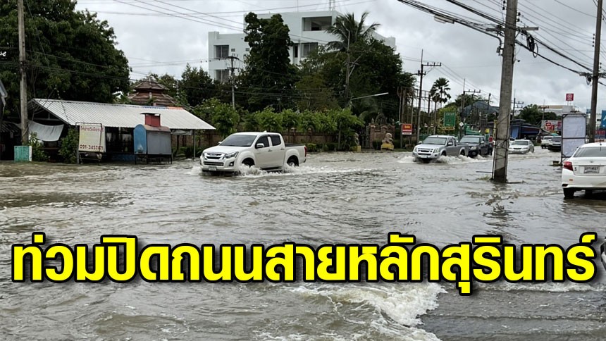 อิทธิพลโนรู! ฝนกระหน่ำสุรินทร์ 2 วันติด น้ำท่วมปิดถนนสายหลัก รถเล็กผ่านไม่ได้