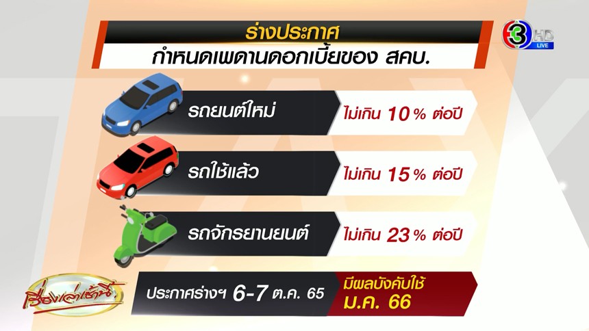 นายวิสิทธิ์ พึ่งพรสวรรค์ ประธานสมาคมเช่าซื้อไทย และกรรมการผู้จัดการ บริษัท ซีไอเอ็มบี ไทย ออโต้ จำกัด เปิดเผยว่า คาด“ร่างประกาศคณะกรรมการว่าด้วยสัญญาเกี่ยวกับเรื่องเช่าซื้อรถยนต์ และรถจักรยานยนต์” ที่มีกระแสข่าวกำหนดเพดานดอกเบี้ยของ สคบ.สำหรับรถยนต์ใหม่เพดานไม่เกิน 10% ต่อปี ,รถใช้แล้ว (รถมือสอง) ไม่เกิน 15% ต่อปี และรถจักรยานยนต์ ไม่เกิน 23% ต่อปี ที่คาดว่า จะประกาศออกมาในช่วงปลายสัปดาห์นี้ (6-7 ต.ค.) มาใช้ได้ และคาดว่าจะมีผลบังคับใช้จริง เดือน ม.ค.ปี 2566
