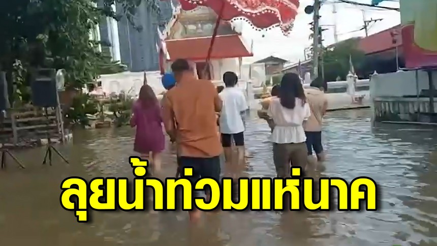 ไม่สนน้ำท่วม! พ่อแม่ลุยน้ำ แห่นาคเข้าโบสถ์ เผยตั้งใจยังไงลูกต้องได้บวชพระ