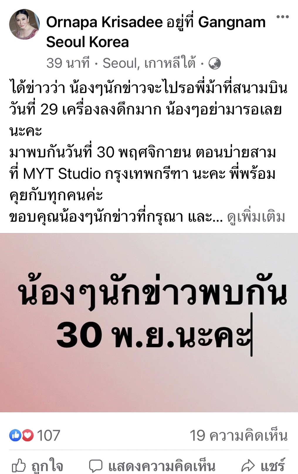 “ได้ข่าวว่า น้องๆ นักข่าวจะไปรอพี่ม้าที่สนามบินวันที่ 29 เครื่องลงดึกมาก น้องๆ อย่ามารอเลยนะคะ