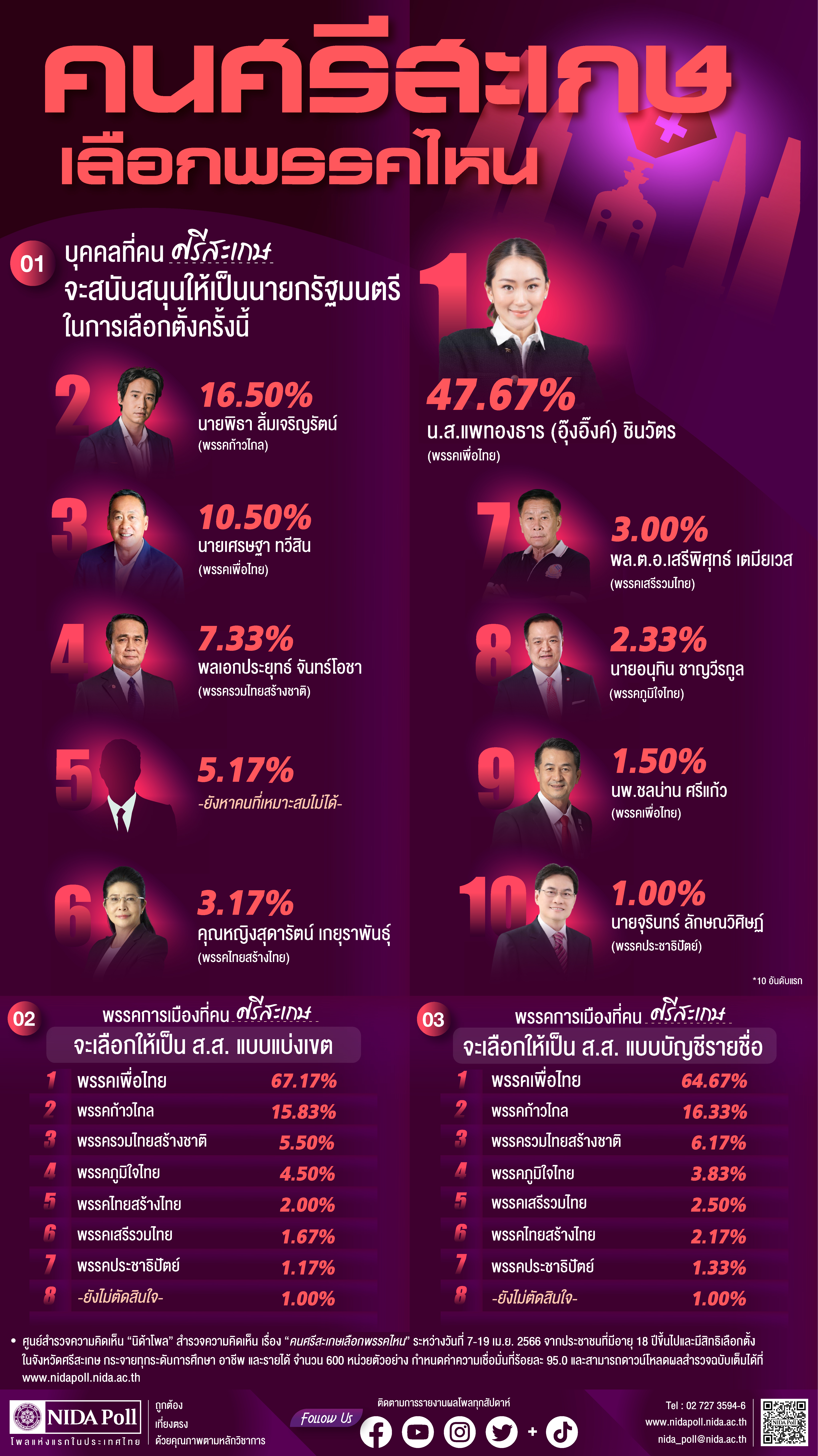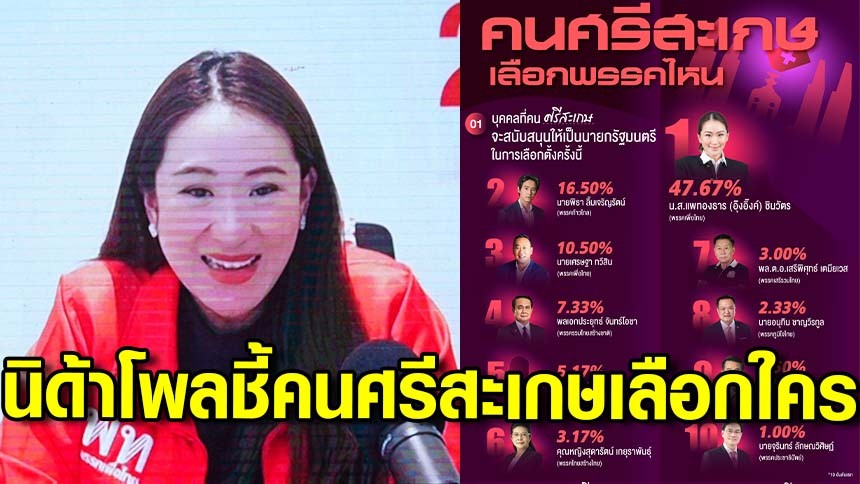 "นิด้าโพล" เผย ผลสำรวจ "คนศรีสะเกษเลือกพรรคไหน” - "อุ๊งอิ๊ง" มาอันดับ 1 ตามมาด้วย "พิธา"