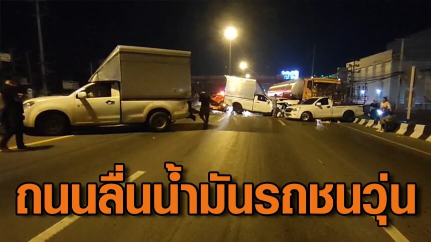 ถนนลื่นน้ำมัน รถชนกันวุ่น 7 คัน บาดเจ็บ 6 ราย