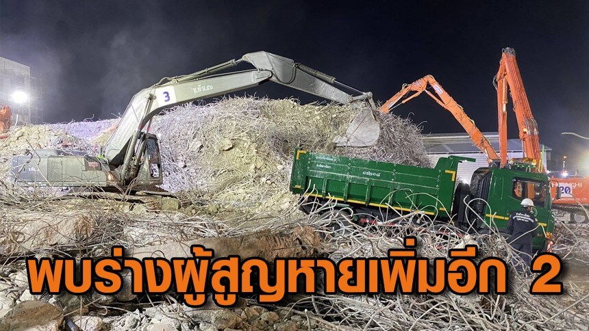 พบร่างผู้สูญหายเพิ่มอีก 2 เจ้าหน้าที่กู้ซากอาคาร สตง. เพิ่มเครื่องจักรหนักเข้าช่วยรื้อถอนซากตึก สตง.