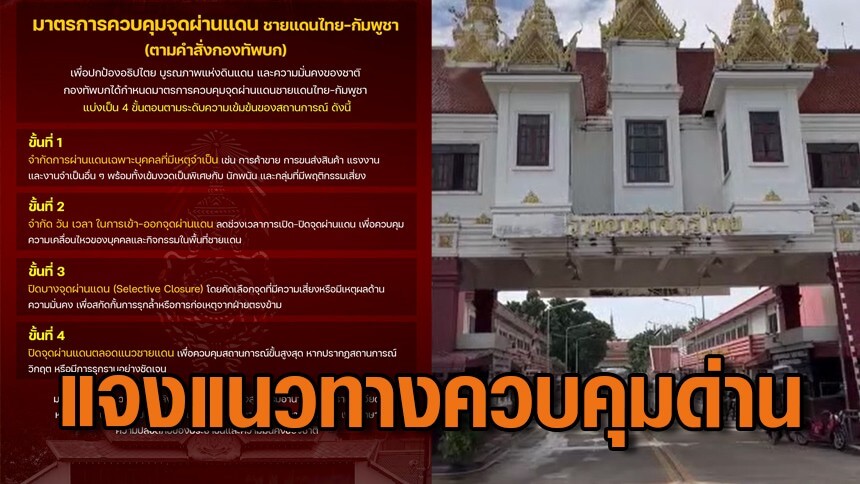 เมื่อวันที่ 7 มิ.ย.68 ที่กองบัญชาการกองทัพบก พล.ต.วินธัย สุวารี โฆษกกองทัพบก เปิดเผยว่าจาก กรณีที่กองทัพบกได้ออกคำสั่งให้มีการควบคุมจุดผ่านแดนทุกประเภทตลอดแนวชายแดนไทย–กัมพูชา เพื่อรักษาอธิปไตย บูรณภาพแห่งดินแดน และความมั่นคงของชาติ การดำเนินการตามคำสั่งดังกล่าวมิได้เป็นการใช้มาตรการสูงสุดในทันที แต่เป็นแนวทางปฏิบัติแบบขั้นตอน โดยพิจารณาจากระดับความรุนแรงของสถานการณ์ในแต่ละพื้นที่ โดยแบ่งออกเป็น 4 ขั้นตอนหลัก ดังนี้