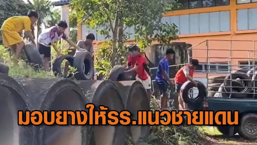 ชาวบ้านมอบยางกว่า 100 เส้นให้รร.แนวชายแดน จ.ตราด หลังพบบังเกอร์หลบภัยไม่เพียงพอต่อจำนวนนร.