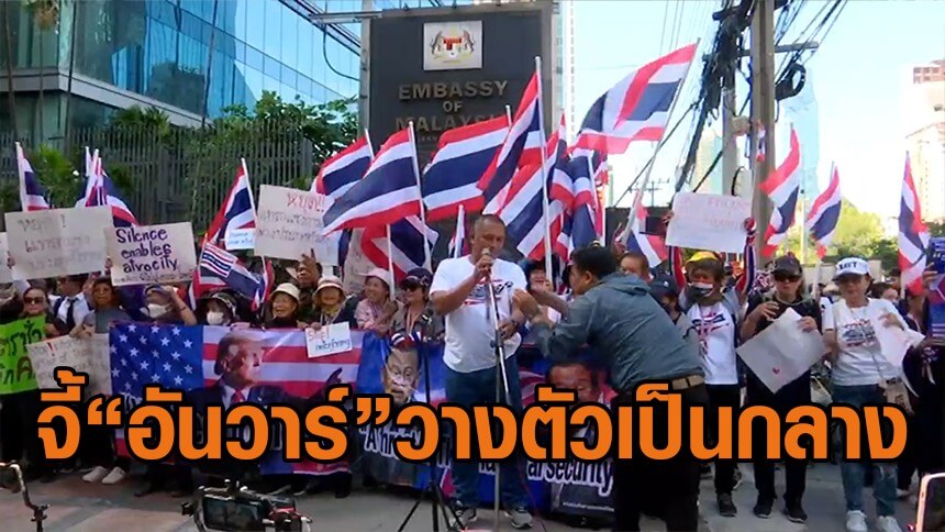 กลุ่มรวมพลังแผ่นดินปกป้องอธิปไตยประท้วงหน้าสถานทูตมาเลเซีย เรียกร้อง “อันวาร์” วางตัวเป็นกลาง