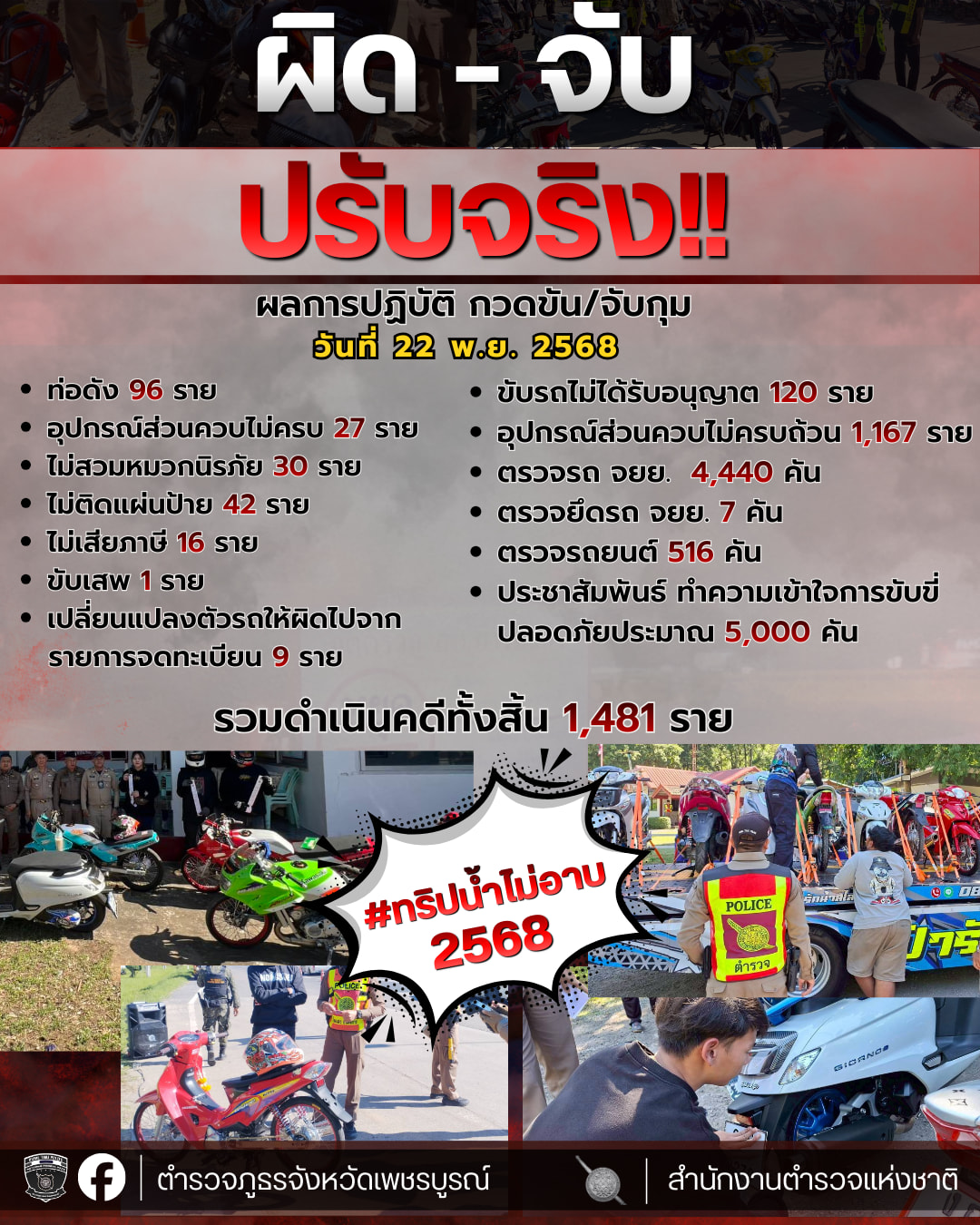 เฟซบุ๊กสำนักงานตำรวจแห่งชาติ เผย ตำรวจ ภ.จว.เพชรบูรณ์ รายงานว่า 08.00 - 16.00 น. วันนี้ (22 พ.ย.68) พล.ต.ต.สารนัย คงเมือง ผบก.ภ.จว.เพชรบูรณ์ รายงานผลการปฏิบัติ ของ ภ.จว.เพชรบูรณ์ บูรณาการร่วมกับส่วนราชการที่เกี่ยวข้องตั้งจุดตรวจจุดสกัด กวดขันวินัยจราจร และป้องกันเหตุในเส้นทางถนนผ่านของนักท่องเที่ยวทริป "น้ำไม่อาบ" ของแหล่งท่องเที่ยวภูทับเบิก อ.หล่มเก่า จว.เพชรบูรณ์ เพื่อป้องกันและลดอุบัติเหตุจราจร พร้อมทั้งดูแลความปลอดภัยในชีวิตและทรัพย์สินของนักท่องเที่ยว