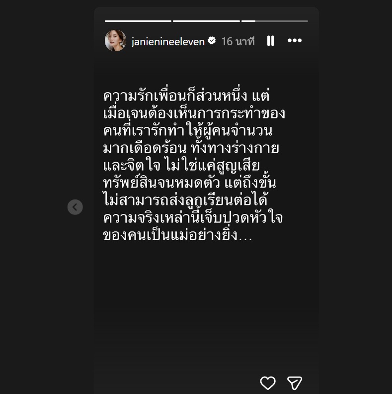 ล่าสุดสาว “เจนี่” ได้โพสต์ข้อความอีกครั้งในอินสตาแกรมสตอรีว่า “ความรักเพื่อนก็ส่วนหนึ่งแต่เมื่อเจนต้องเห็นการกระทำของคนที่เรารัก ทำให้ผู้คนจำนวนมากเดือดร้อนทั้งทางร่างกายและจิตใจ ไม่ใช่แค่สูญเสียทรัพย์สินจนหมดตัว แต่ถึงขั้นไม่สามารถส่งลูกเรียนต่อได้ ความจริงเหล่านี้เจ็บปวดหัวใจของคนเป็นแม่อย่างยิ่ง...”