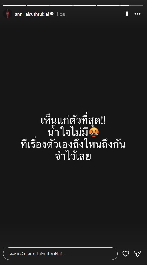 ขณะที่ “แอน อลิชา หิรัญพฤกษ์” ซึ่งออกตัวขอเป็นเสาหลักยืนอยู่ตรงกลางดรามา นานา ก็โพสต์สอตรีว่า “เห็นแก่ตัวที่สุด น้ำใจไม่มี ทีเรื่องตัวเองถึงไหนถึงกัน จำไว้เลย”