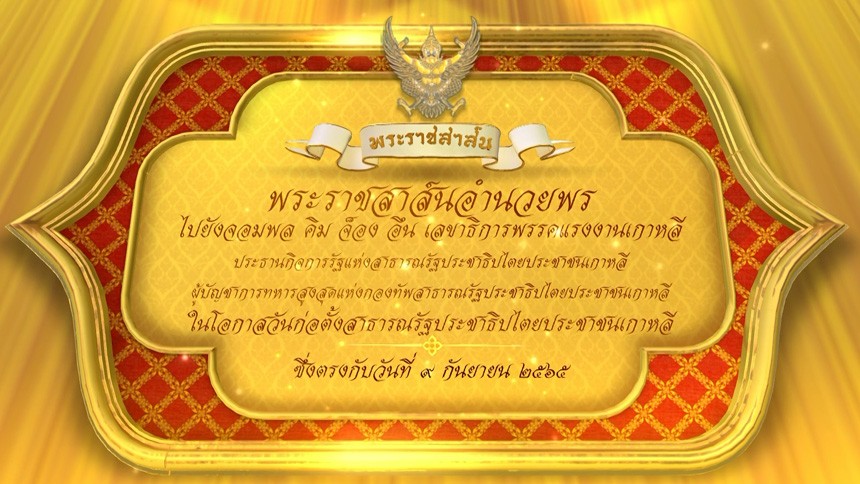 วันนี้ พระบาทสมเด็จพระเจ้าอยู่หัว ทรงพระกรุณาโปรดเกล้าโปรดกระหม่อม ให้ส่งข้อความพระราชสาส์นอำนวยพร ไปยังจอมพล คิม จ็อง อึน เลขาธิการพรรคแรงงานเกาหลี ประธานกิจการรัฐแห่งสาธารณรัฐประชาธิปไตยประชาชนเกาหลี ผู้บัญชาการทหารสูงสุด แห่งกองทัพสาธารณรัฐประชาธิปไตยประชาชนเกาหลี ในโอกาสวันก่อตั้งสาธารณรัฐประชาธิปไตยประชาชนเกาหลี ซึ่งตรงกับวันที่ 9 กันยายน 2565 ความว่า "