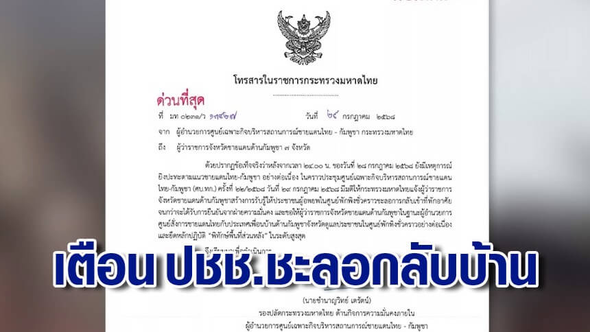 มท.ส่งหนังสือด่วนถึงผู้ว่าฯ 7 จังหวัด เตือนปชช.ชะลอกลับบ้าน - ชาวบ้านลั่น ไม่เชื่อเขมรหยุดยิงจริง