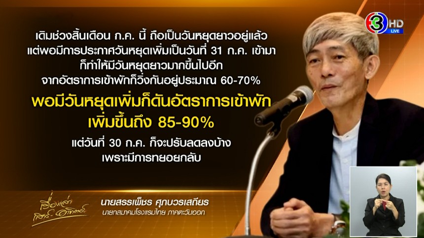 “เดิมช่วงสิ้นเดือนกรกฎาคมนี้ ถือเป็นวันหยุดยาวอยู่แล้ว แต่พอมีการประกาศวันหยุดเพิ่มเป็นวันที่ 31 กรกฎาคมเข้ามา ก็ทำให้มีวันหยุดยาวมากขึ้นไปอีก จากที่อัตราการเข้าพักก็วิ่งกันอยู่ประมาณ 60-70% พอมีวันหยุดเพิ่มก็ดันอัตราการเข้าพักเพิ่มขึ้นถึง 85-90%