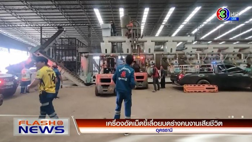 เกิดเหตุเครื่องอัดเม็ดขี้เลื่อย ของโรงงานแห่งหนึ่ง ในจังหวัดอุดรธานี บดร่างของช่างประจำโรงงาน อายุ 48 ปี เสียชีวิต เพื่อนคนงาน ระบุว่า เครื่องอัดเม็ดขี้เลื่อยขัดข้อง ผู้ตายจึงขึ้นไปซ่อม และระหว่างทดลองเดินเครื่อง คาดว่าถูกรางอัดเม็ดขี้เลื่อย ดึงร่างเข้าไปบีบอัดจนเสียชีวิต