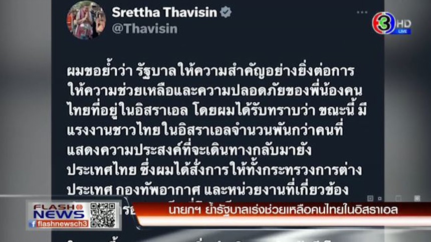 นายเศรษฐา ทวีสิน นายกรัฐมนตรี ย้ำรัฐบาลให้ความสำคัญ ต่อการช่วยเหลือ และความปลอดภัยของคนไทยในอิสราเอล กำชับทุกหน่วยงานเร่งดำเนินการ พร้อมสั่งการสถานฑูตไทยที่เกี่ยวข้อง ให้ติดต่อกับมิตรประเทศ เพื่อประสานงานในการปล่อยตัวคนไทยที่ถูกจับกุม เตรียมอพยพคนไทยชุดแรก 15 คน กลับถึงไทย 12 ตุลาคมนี้