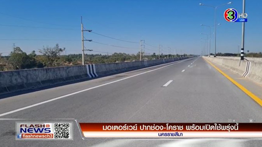 แขวงทางหลวงนครราชสีมาที่ 2 เคลียร์พื้นที่เสร็จ 100 เปอร์เซ็นต์ พร้อมเปิดใช้ถนนมอเตอร์เวย์ ระยะทาง 70 กิโลเมตร ตั้งแต่ อำเภอปากช่อง ถึงถนนเลี่ยงเมืองโคราช โดยจะเปิดใช้พรุ่งนี้ ตั้งแต่เวลา 20 นาฬิกาเป็นต้นไป ซึ่งเป็นการเปิดใช้ก่อนกำหนด1วัน ทั้งนี้เพื่ออำนวยความสะดวกสำหรับผู้ที่จะเดินทางช่วงเทศกาลปีใหม่