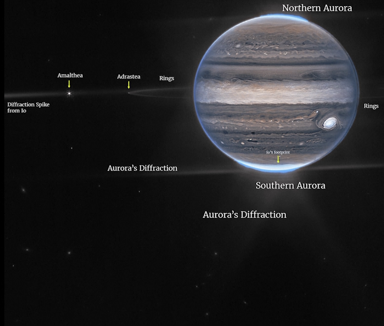 นอกจากนี้ ยังมีภาพมุมกว้างอีกมุมของดาวพฤหัสที่แสดงให้เห็นวงแหวนจางๆ และดวงจันทร์ดวงเล็กๆ 2 ดวงที่ตัดกับพื้นหลักของกาแล็กซี่ที่ส่องประกายระยิบระยับ ดาวพฤหัสถือเป็นดาวเคราะห์ที่มีขนาดใหญ่ที่สุดในระบบสุริยะจักรวาล