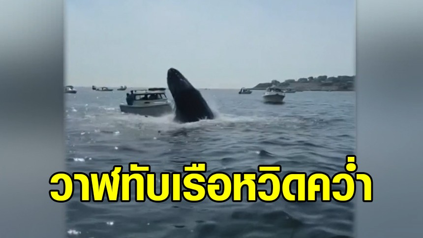 ชมภาพเหตุการณ์ซึ่งเกิดขึ้นบริเวณชายฝั่งของเมืองไพล์มัธ ในรัฐแมสซาซูเซตส์ ของสหรัฐ โดยเป็นภาพที่วาฬหลังค่อมขนาดยักษ์ ที่จู่ๆ ก็โผล่ขึ้นเหนือมาเหนือน้ำ ทับบริเวณหัวเรือขนาดเล็กลำหนึ่งที่ลอยอยู่เรือจนเกือบพลิกคว่ำ