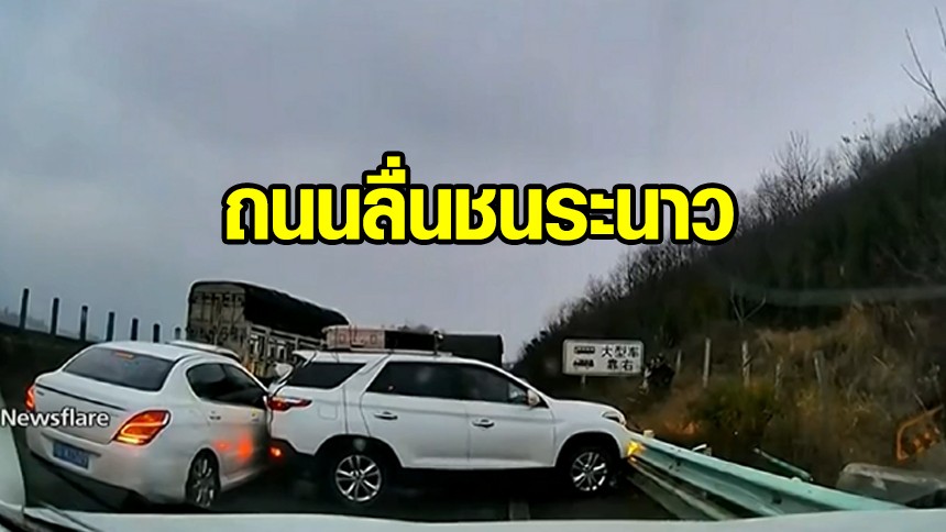 ถนนลื่น รถชนระนาวในจีน โชคดีไม่มีผู้เสียชีวิต