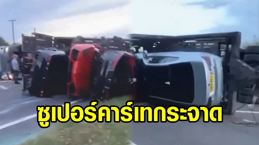 ‘ซูเปอร์คาร์’ เทกระจาด 9 คัน ในอังกฤษ หลังรถบรรทุกขนรถพลิกคว่ำ