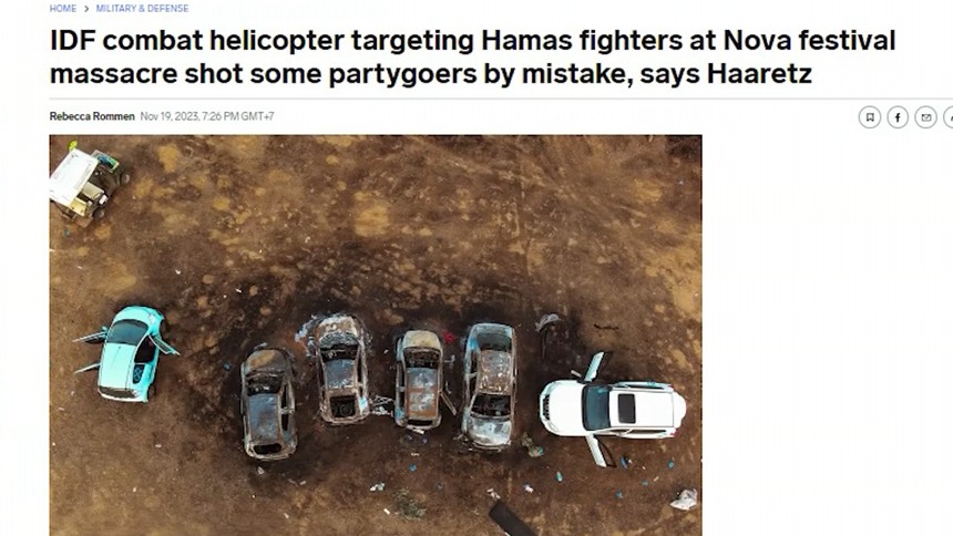 สื่ออิสราเอล อ้างผลสอบสวนของตำรวจ ซึ่งพบว่า เฮลิคอปเตอร์ลำหนึ่งของกองกำลังป้องกันอิสราเอล (IDF) มีการยิงใส่พลเรือนนักท่องเที่ยวในงานเทศกาลดนตรี 'ซูเปอร์โนวา' ระหว่างที่พวกฮามาสบุกโจมตี เมื่อวันที่ 7 ต.ค. ขณะที่ตำรวจอิสราเอลรีบออกมาแถลงปฏิเสธ พร้อมย้ำเตือนสื่อในประเทศ ให้รายงานข้อมูลอย่าง 'รับผิดชอบ'