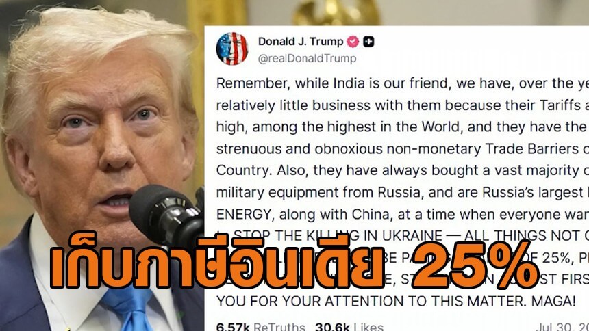 'ทรัมป์' ประกาศเก็บภาษีอินเดีย 25% ขู่เพิ่มโทษอีก ฐานซื้อพลังงาน-อาวุธ จากรัสเซีย