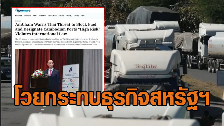 เว็บไซต์ข่าว คิรี โพสต์ ของกัมพูชา รายงานว่า หอการค้าอเมริกันในกัมพูชา เตือนว่าการที่ไทยขู่จะปิดกั้นการขนส่งน้ำมันเชื้อเพลิง และกำหนดให้ท่าเรือกัมพูชาเป็นพื้นที่เสี่ยงสูงนั้น ถือเป็นการละเมิดกฎหมายระหว่างประเทศ