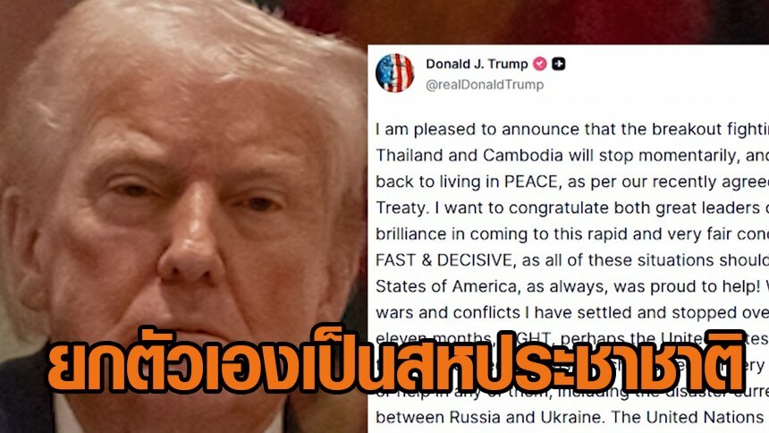 ทรัมป์ระบุว่า "ผมยินดีที่จะประกาศว่า การปะทะกันระหว่างไทยและกัมพูชาจะยุติลงในไม่ช้า และทั้งสองประเทศจะกลับไปใช้ชีวิตอย่างสงบสุข ตามสนธิสัญญาฉบับเดิมที่เราได้ตกลงกันไว้เมื่อเร็วๆ นี้ ผมขอแสดงความยินดีกับผู้นำทั้งสองท่านในความชาญฉลาดที่นำมาซึ่งข้อสรุปที่รวดเร็วและยุติธรรมนี้ มันรวดเร็วและเด็ดขาด เหมือนกับสถานการณ์อื่นๆ ที่ควรจะเป็น! สหรัฐอเมริกาภูมิใจที่ได้ให้ความช่วยเหลือเสมอมา! ด้วยสงครามและความขัดแย้งทั้งหมดที่ผมได้ไกล่เกลี่ยและยุติลงในช่วงสิบเอ็ดเดือนที่ผ่านมา บางทีสหรัฐอเมริกาอาจกลายเป็นสหประชาชาติที่แท้จริง ซึ่งให้ความช่วยเหลือหรือสนับสนุนเพียงเล็กน้อยในสถานการณ์ต่างๆ รวมถึงภัยพิบัติที่กำลังเกิดขึ้นระหว่างรัสเซียและยูเครน สหประชาชาติจะต้องเริ่มมีบทบาทและมีส่วนร่วมในสันติภาพโลก!"