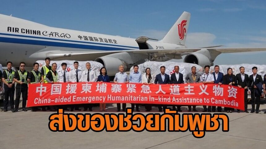 ความช่วยเหลือด้านมนุษยธรรมฉุกเฉินชุดแรกที่รัฐบาลจีนมอบให้แก่กัมพูชาได้เดินทางถึงสนามบินนานาชาติเตโช ในกรุงพนมเปญเมื่อวันอาทิตย์ที่ผ่านมา ด้วยเครื่องบินขนส่งคาร์โก้แบบโบอิ้ง 747 ของสายการบินแอร์ ไชน่า โดย สิ่งของบรรเทาทุกข์ประกอบด้วยเต็นท์ ผ้าห่ม และอาหาร เป็นต้น