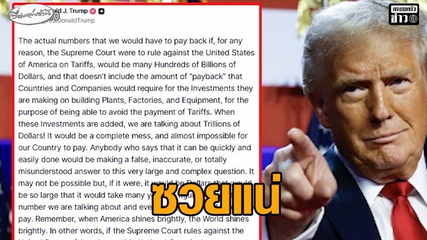 'ทรัมป์' บอก "ซวยแน่" หากศาลตัดสินคัดค้านมาตรการภาษี ต้องจ่ายเงินคืนอาน