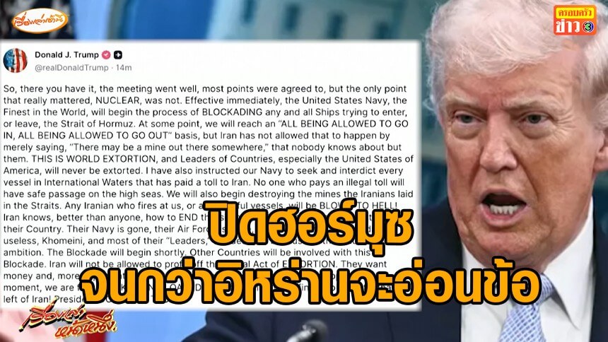 'ทรัมป์' ประกาศปิดล้อมช่องแคบฮอร์มุซ จนกว่าอิหร่านจะอ่อนข้อ