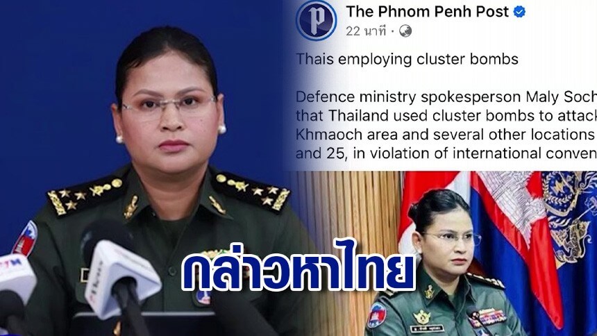 มาลี โสเจียตา (Maly Socheatea) โฆษกกระทรวงกลาโหมของกัมพูชาออกมาแถลงในวันนี้กล่าวหาฝ่ายไทยว่า ใช้ระเบิดคลัสเตอร์ (Cluster Bomb) หรือระเบิดลูกปราย โจมตียอดเขาพนม กมอช (Phnom Khmaoch) ในจังหวัดโพธิสัตว์ และอีกหลายพื้นที่ตั้งแต่เมื่อวานนี้ ซึ่งถือเป็นการละเมิดสนธิสัญญาระหว่างประเทศ