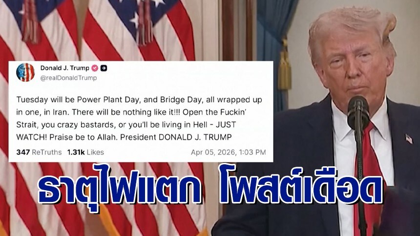 ข้อความที่ทรัมป์โพสต์มีใจความว่า "วันอังคารนี้จะเป็นวันโรงไฟฟ้าและวันสะพานในอิหร่าน รวมกันเป็นวันเดียว จะไม่มีอะไรเหมือนวันนี้อีกแล้ว!!! เปิดช่องแคบซะ ไอ้พวกบ้า ไม่งั้นพวกแกจะต้องตกนรก - คอยดู!