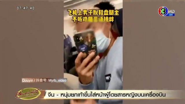 ภาพบนเหตุการณ์บนเครื่องบินเสฉวนแอร์ไลน์ ของประเทศจีน เที่ยวบินระหว่างคุนหมิง-เฉิงตู มีผู้โดยสารชายรายหนึ่งถอดรองเท้า ทางผู้โดยสารหญิงที่เห็นจึงถ่ายคลิป แต่ชายคนดังกล่าวกลับท้าทาย ยกเท้าขึ้นใส่ตอบโต้ฝ่ายหญิง ก่อนพูดว่า "โดนซะ"