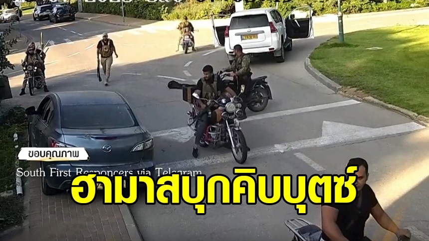 ขณะที่มีภาพเหตุการณ์จากกล้องวงจรปิด ช่วงเวลาขณะที่กลุ่มฮามาส ได้บุกเข้ามายังนิคมการเกษตร คิบบุตซ์ และก่อการสังหารหมู่ ซึ่งเป็นจุดที่เลวร้ายที่สุดแห่งหนึ่ง มีภาพกลุ่มนักรบฮามาสได้บุกมายังเมือง โดยใช้ทั้งมอเตอร์ไซค์ และรถยนต์ บุกเข้าโจมตีอย่างรวดเร็ว